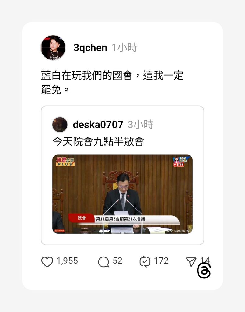 @davelin - 今天是立法院史上最長延會的第52天,早上立法院藍白多數再度通過了延長延會時間,一共...