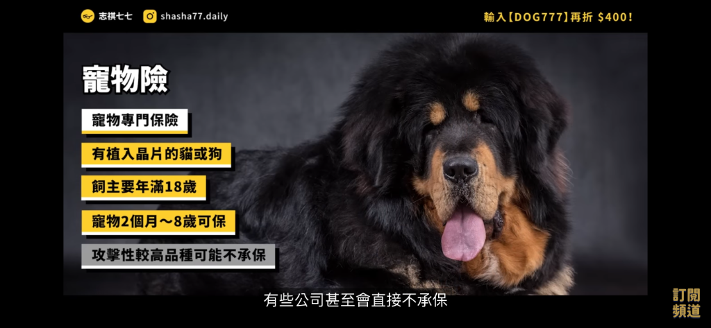 在影片中,志祺七七首先介紹了寵物險的基本運作模式:這是針對貓狗設計的專屬保險,保障範圍包括寵物醫療、責任理賠(如寵物咬傷他人導致賠償)、住宿費用(如飼主出國時的寵物臨時托管)、以及喪葬或失蹤補償等。然而,投保寵物險仍有諸多限制,包括:
