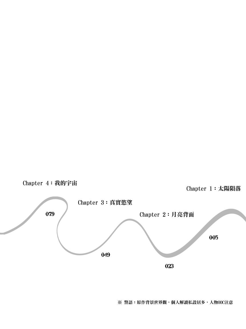 Chapter 1:太陽隕落 The Fallen Sun Chapter 2:月亮背面 The Dark Side of the Moon Chapter 3:真實慾望 True Desire Chapter 4:我的宇宙 My Universe Chapter 5:光影交界 Light and Shadow Chapter 6:追逐繁星 Chasing the Stars