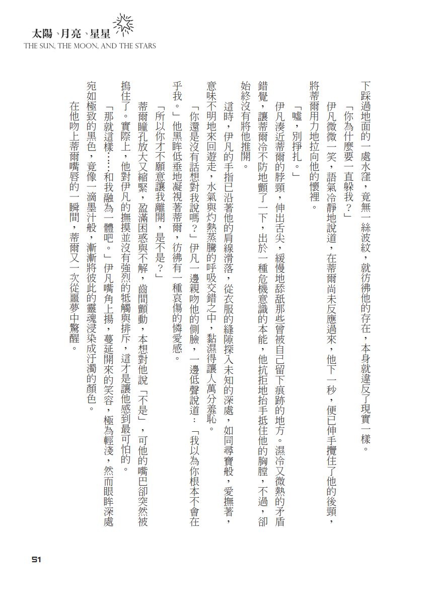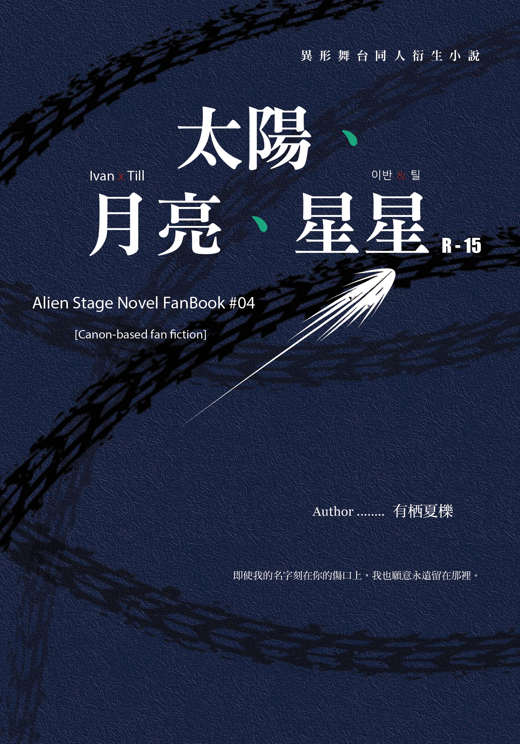 |書名: 太陽、月亮、星星 The Sun, The Moon, The Stars |作者:有栖夏櫟 |配對:Ivan x Till |規格:A5判炫光紙封面/膠裝/內頁米色道林紙100磅/頁數180P/字數約7.4萬字左右 |內容: 原作向設定,KARMA劇情線延伸,前期的伊凡很男鬼,私設腦補居多!潮濕文學感的神交R15風味。 |售價:價格$380 |小說試閱: