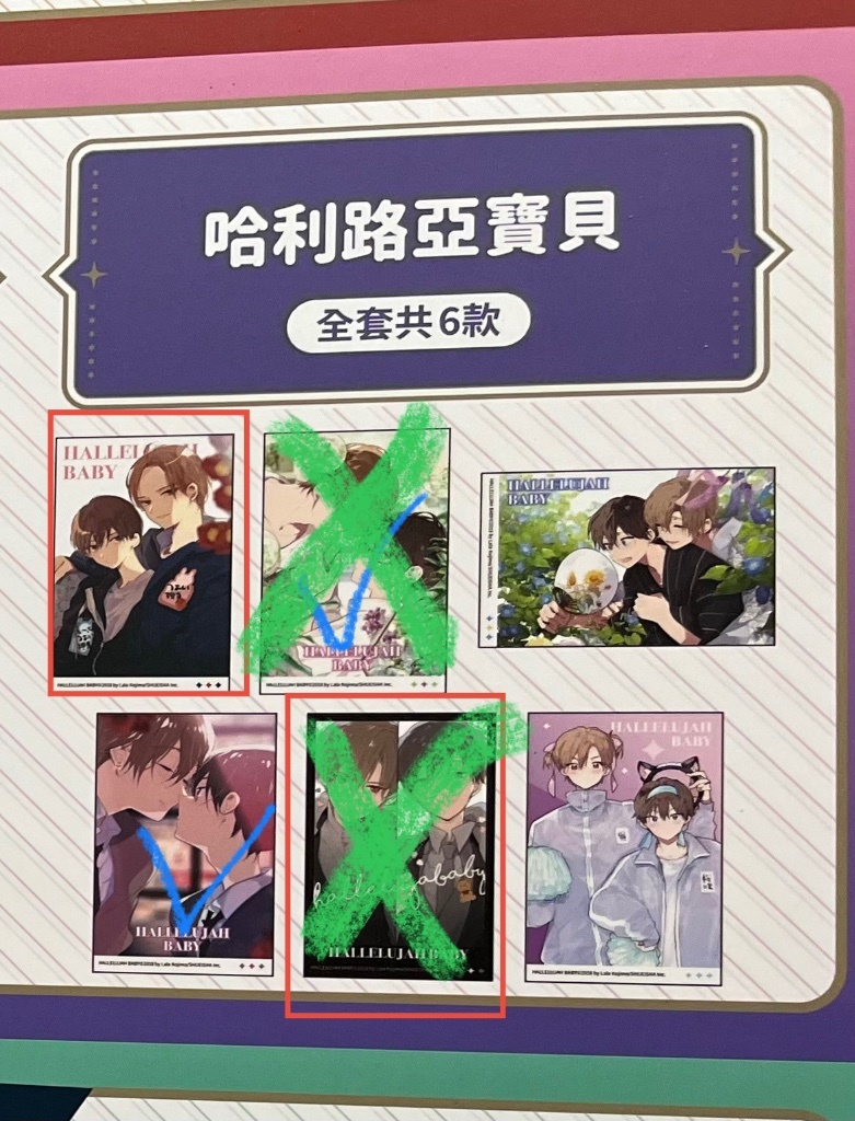 : 因為前面偷偷說的部分有人有先跟我交換哈利路亞寶貝下排中間和上排中間這兩張,所以目前剩下上排左邊紅框的不知道您是不是剛好要交換這張
