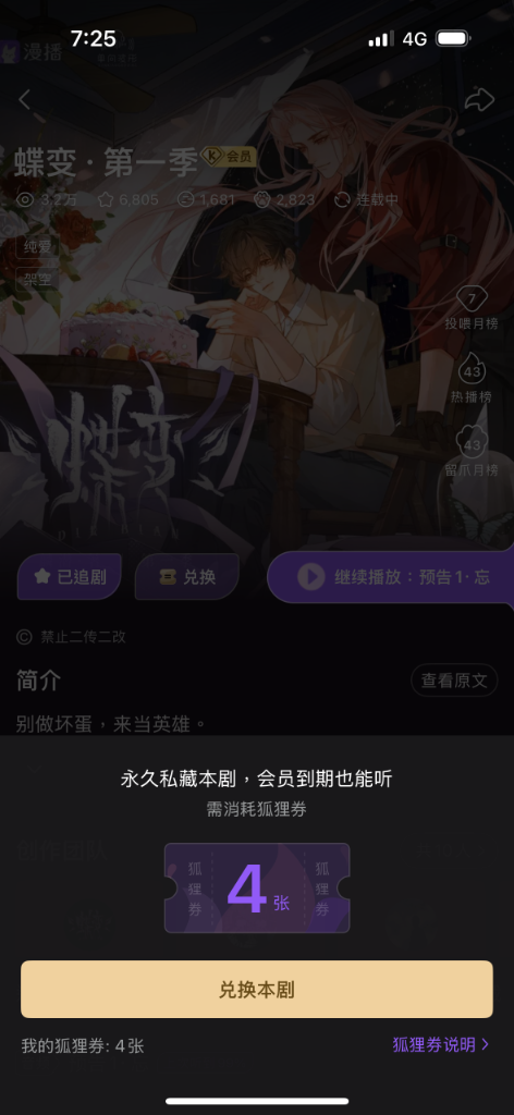 : 漫播要集狐狸券才能買斷,這部要4張狐狸券。然後要開會員才能兌換......。