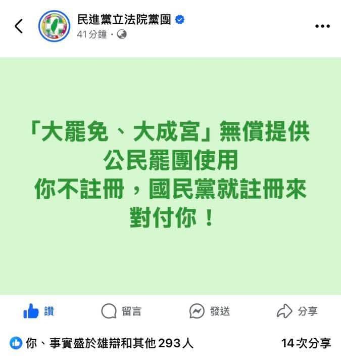 已經證實就是因為國民黨想先一步當商標蟑螂才由民進黨政黨名義註冊再無償授權給公民罷團.而且這筆授權商品還是柯建銘自己掏腰包買的.