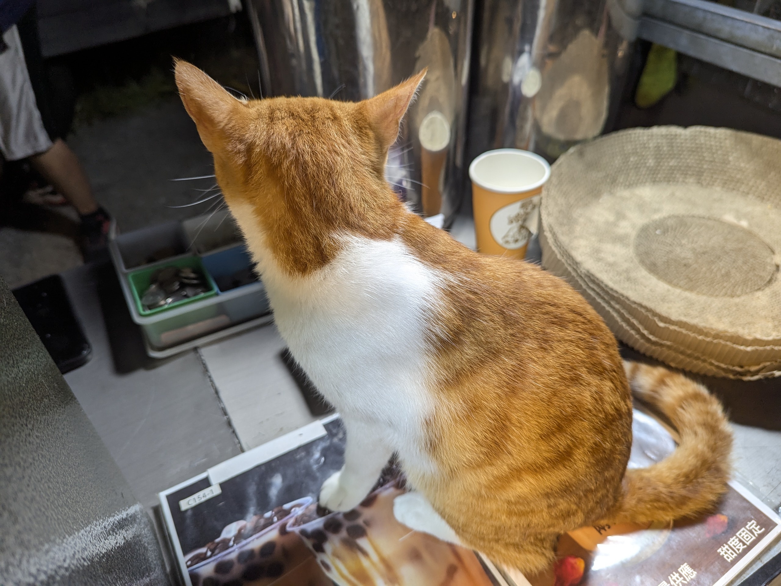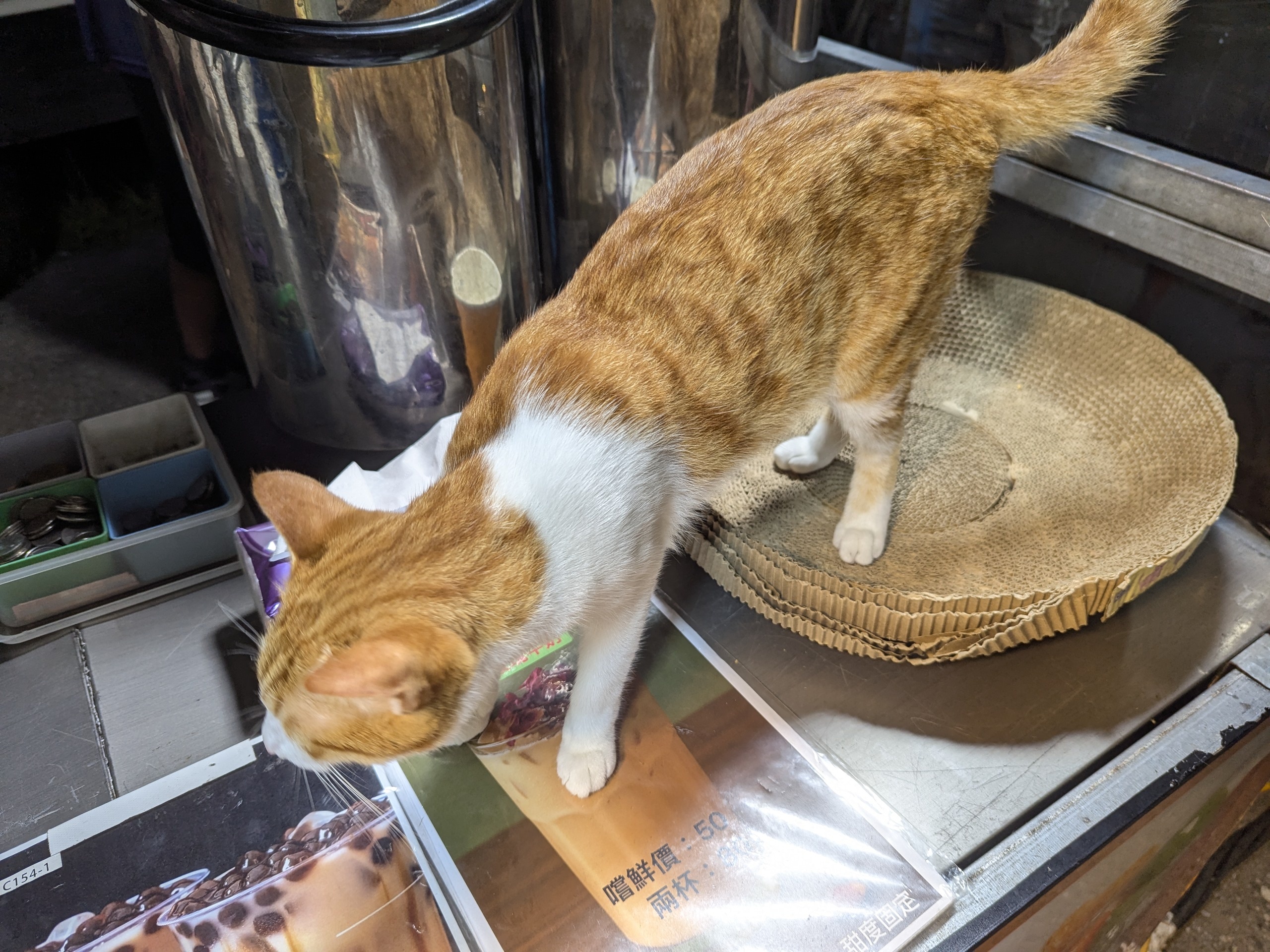 : 夜市飲料攤位上的貓