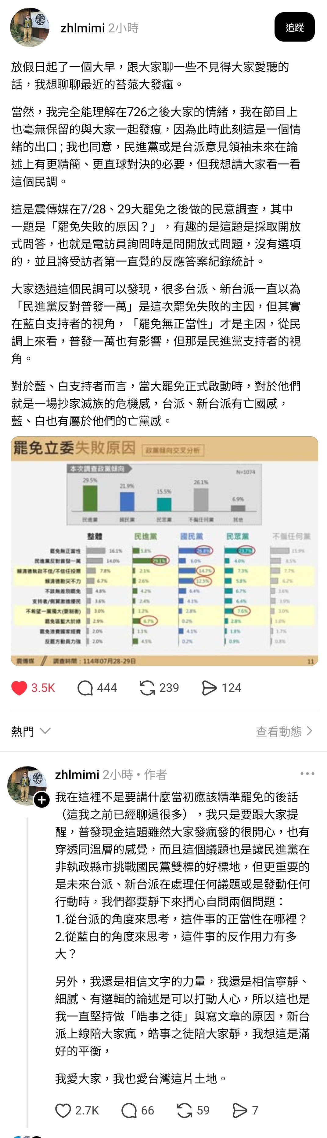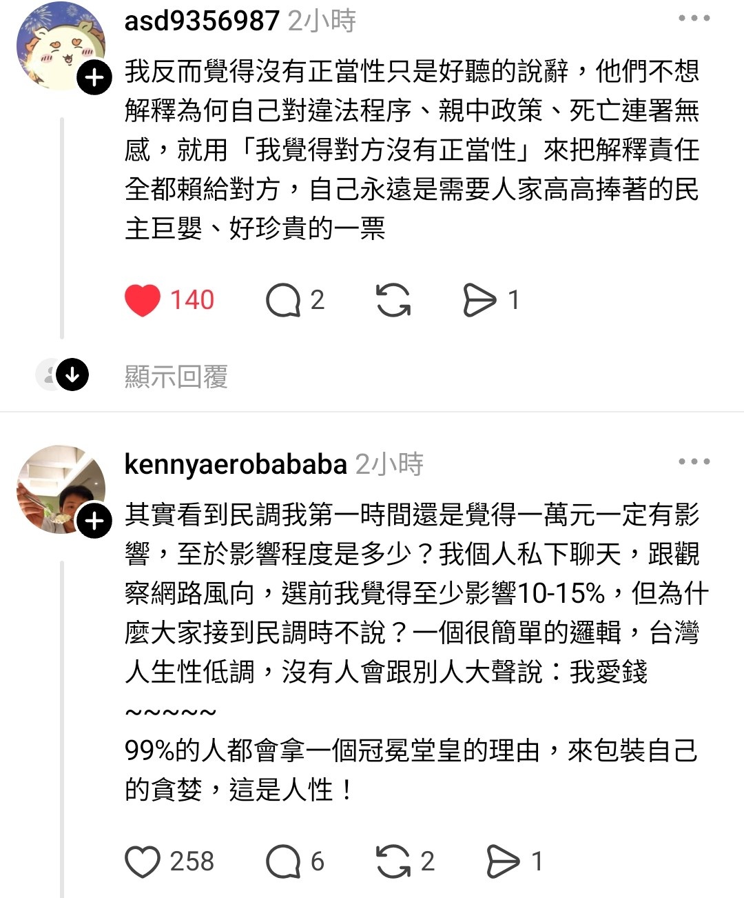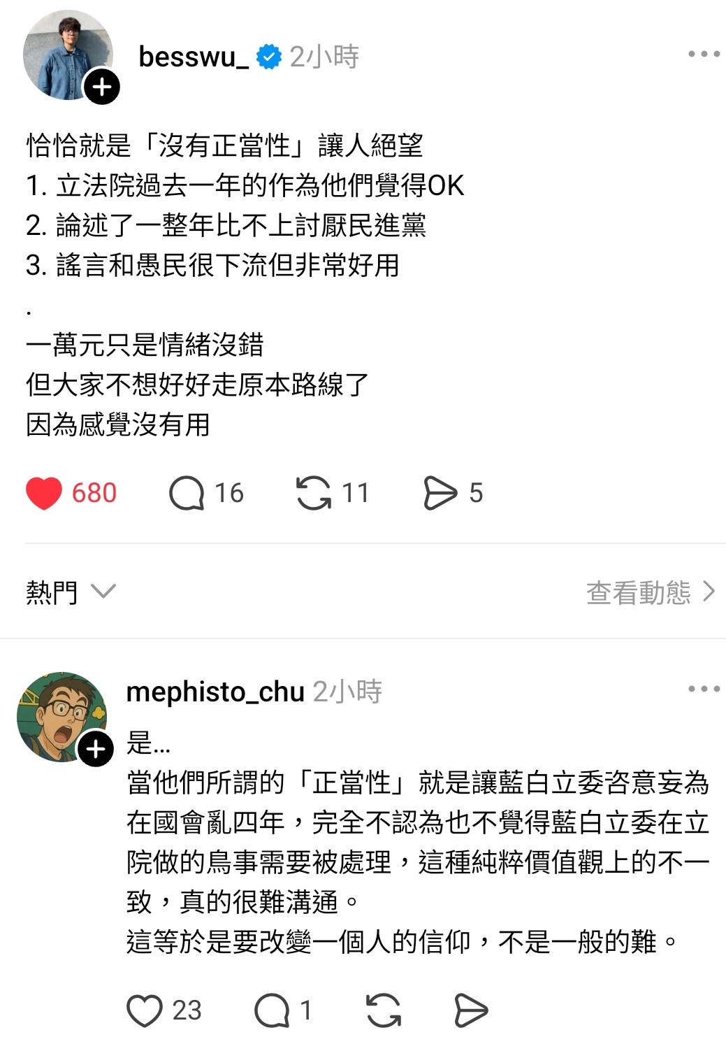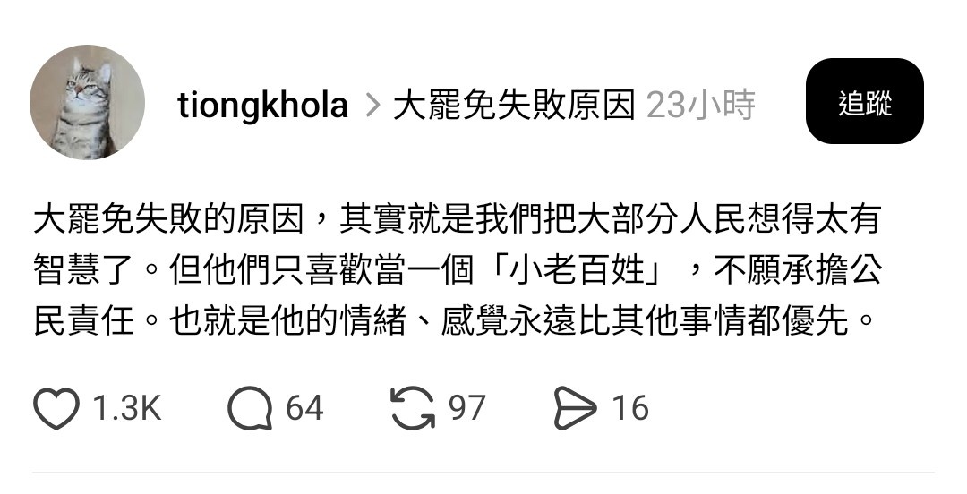 藍營支持者看不到國民黨在做什麼才是真的,所以他們覺得罷免沒有正當性。拿他們在國會的行為去問藍白支持者,他們會半信半疑,然後用我不關心政治啦結束對話,隱約知道不對,但用哪個政治人物沒有手段?大家都一樣髒,強化自己拒絕承認錯誤這個行為的正當性。