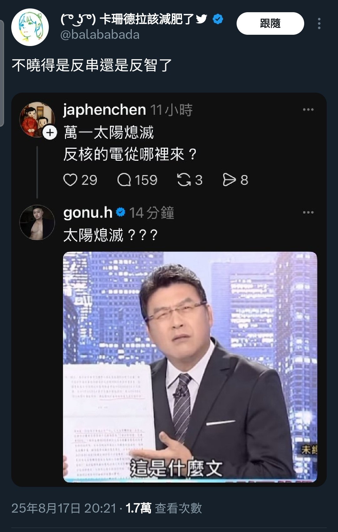 https://images.plurk.com/5FGhST1dZ8L2sPc7xk9VYU.jpg 太陽熄滅可能也是賴清德操縱的。
