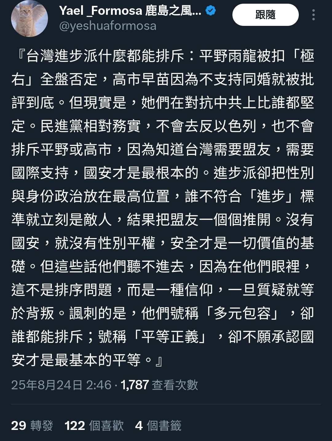 所有進步價值都很重要,但國安才是最基本的平等。