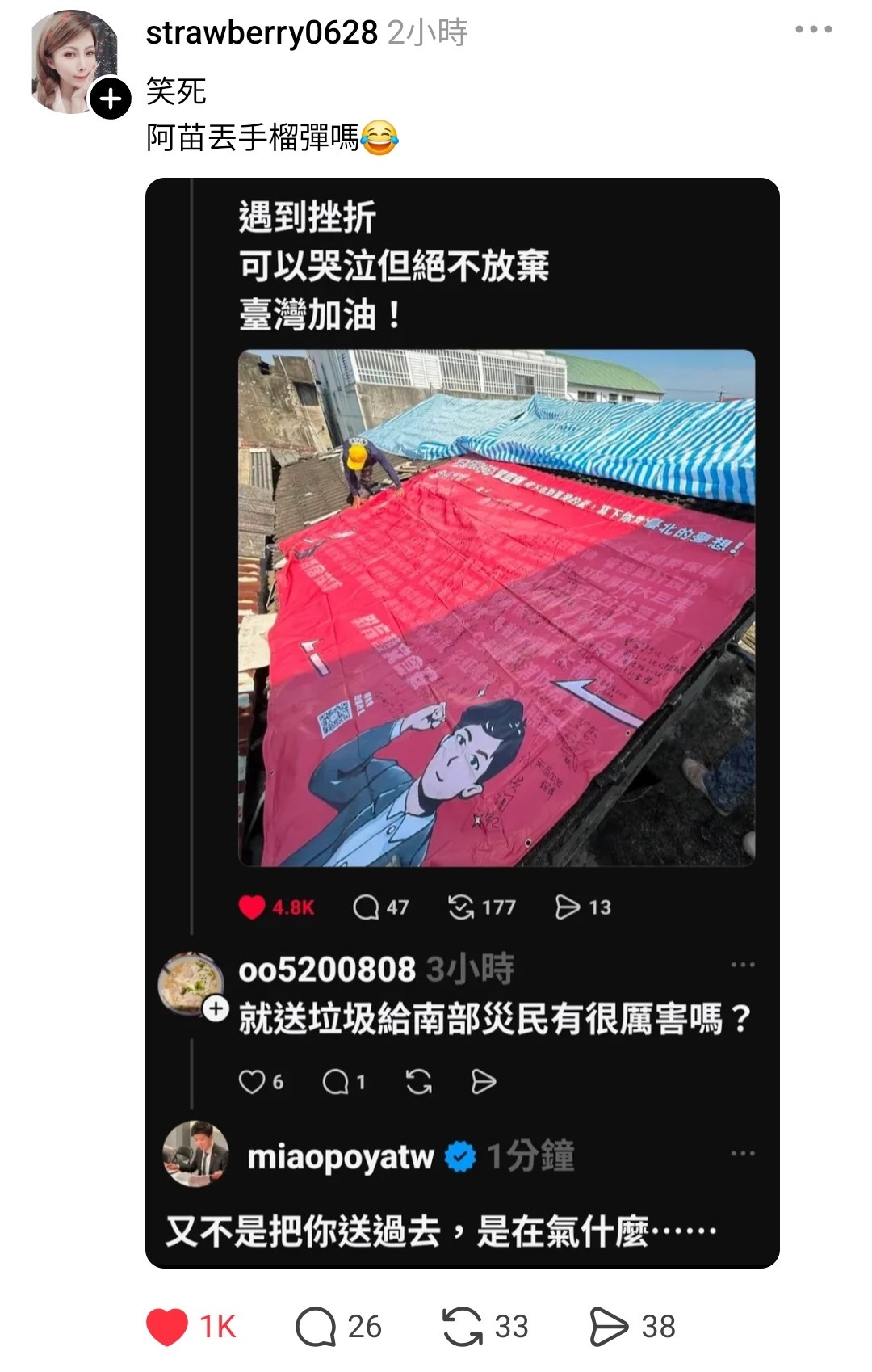https://images.plurk.com/6erbPBbdsM3tYdhQKrjRwg.jpg 帆布很有用。我家祖厝現在也蓋著帆布,真以為颱風過後馬上找得到修紅屋瓦的師傅喔,要排到一年後欸。坐在冷氣房手機沒電就活不下去的人不要隨便曬腦,不要隨便嘴台南人。
