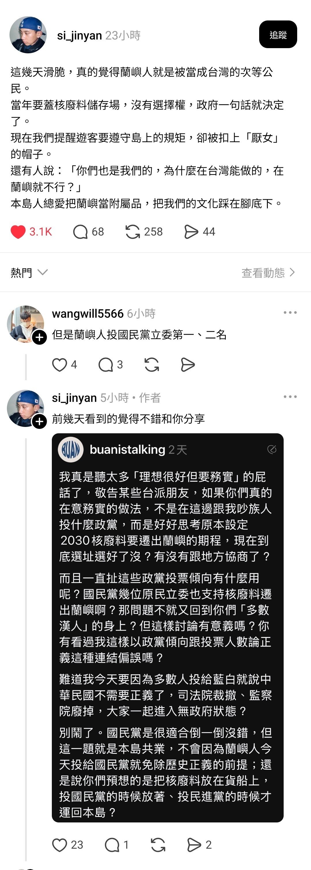 在嫌棄蘭嶼人都投國民黨前,蘭嶼人眼中這是本島漢人和蘭嶼人的問題,有如我們本島的南北問題。