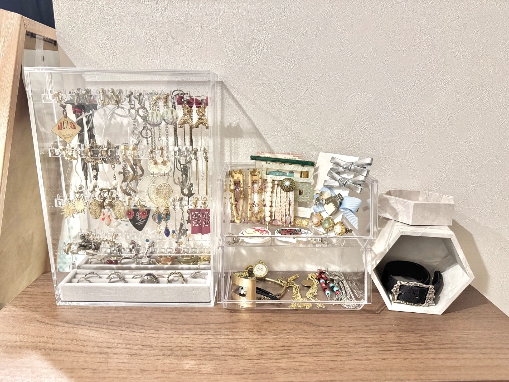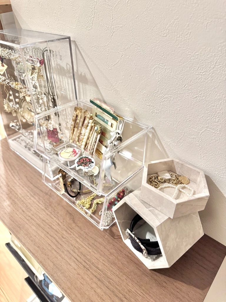 但把東西放上去才想到還沒買室內香氛所以可能還會改一下擺設。但總之除了左邊的耳環戒指是無印外其他都是Seria,太划算了,謝謝Seria感恩Seria