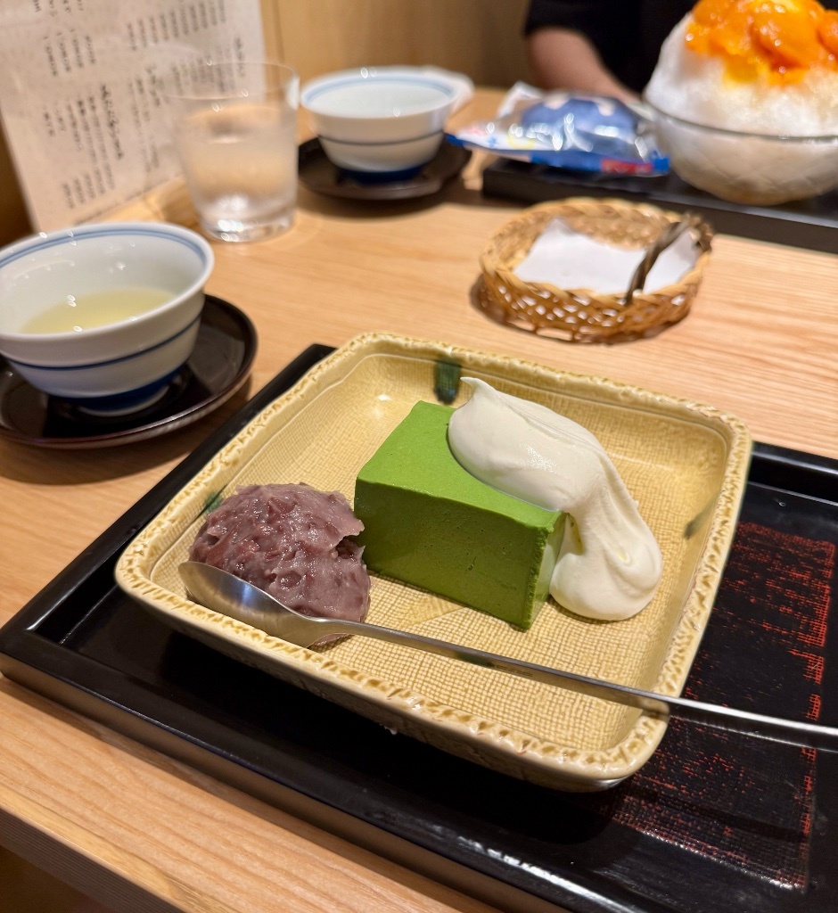 點了最有名的抹茶巴伐利亞布丁。紅豆是有顆粒的豆沙餡(つぶあん),鮮奶油也是很濃厚但清爽的味道。抹茶巴伐利亞布丁其實吃起來就像抹茶奶酪啦但他幾乎不甜,只有抹茶的香味很淡雅,配比較甜的紅豆跟鮮奶油剛剛好。