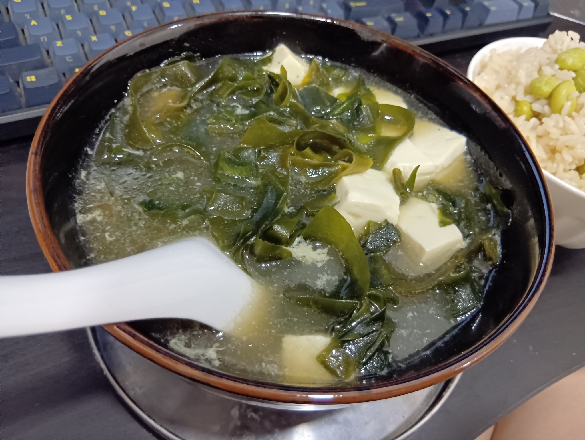 今天一樣吃毛豆飯,湯換成煎蛋湯,加上紫菜和豆腐