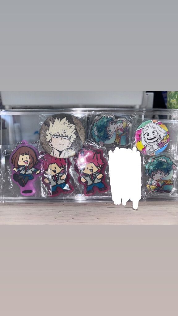 我英Q比娃 渡我(有2)300$/1 ————————————————————----- 已下為現貨 我英原畫展-燙金卡(下收) 40$/1 我英原畫展-回憶小卡 麗日單張(無原包)80$ 我英原畫展-爆豪貼紙 爆豪轟場面150$ 我英小雜物 麗日/切島(有2)軟膠扭蛋80$/1(無蛋殼) 麗日幼年徽120$ 爆豪徽章80$ 綠谷(有2)“同人”壓克力80$/1