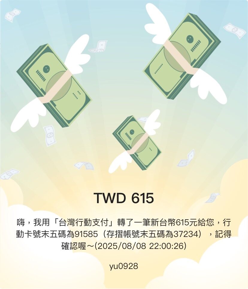 : 好的好的!銀行012台北富邦帳號00713168265588全額1230幫我匯615