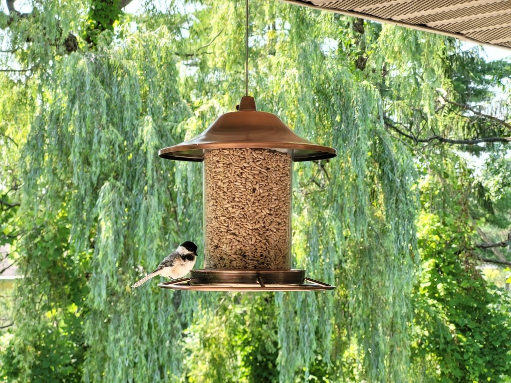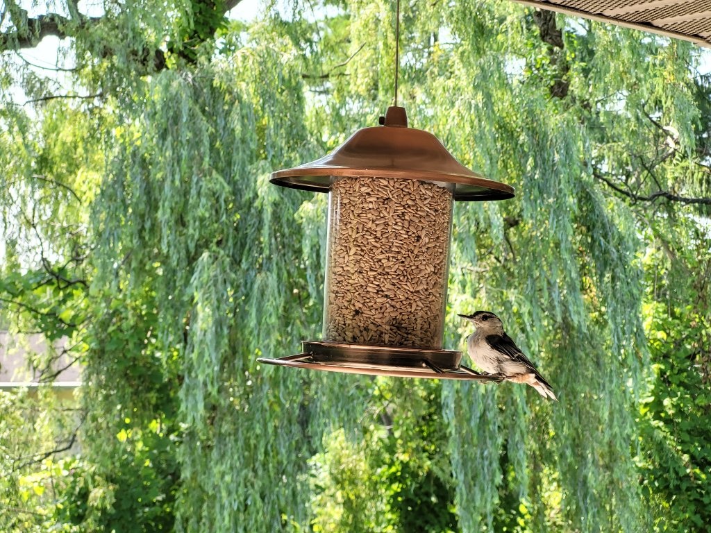 新的家比舊家更大些,陽臺也再大上不少,因為不會長住,今年就不種植了,而是專心餵鳥。才放出飼料沒兩天,就有冠藍鴉和這裡的小曲們來吃飯,十分熱鬧。這裡出現的鳥種也比舊家更多,以啄木鳥為例,以前只有絨啄木鳥會來,紅腹啄木鳥更是少見,現在幾乎每天都可以看到絨啄木鳥、毛啄木鳥和紅腹啄木鳥,或許是因為陽臺外就有樹木可供棲息的緣故。又,因為陽臺和樹木有段距離,房子的外牆也沒有紗網可供生物攀爬,所以在這裡餵鳥不用擔心松鼠作亂,令人感動。