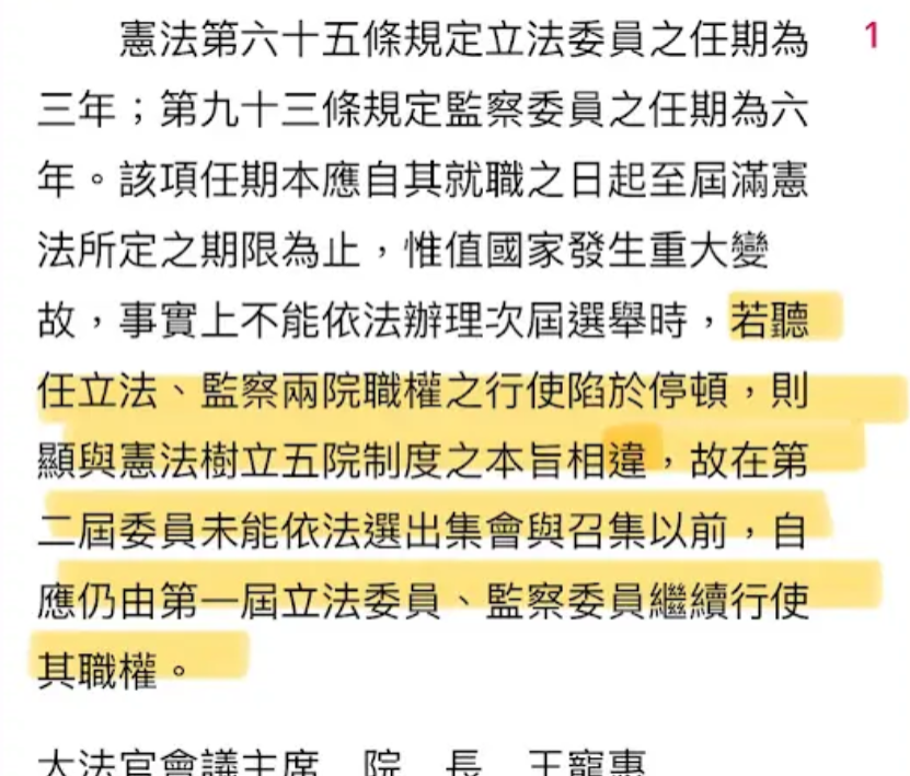 過去國民黨剛佔領台灣時,因為其有效控制領土只剩下台澎金馬,但又不願意在台灣改選立委,所以大法官做成釋字第31號解釋,其中提到無法改選立委與監委時,「若聽任立法與監察兩院職權陷於停頓,則顯與憲法樹立五院制度之本旨相違」,因此第一屆也是唯一一屆由中國選出的立委與監委們可以繼續行使職權到下一次改選為止。
