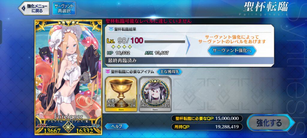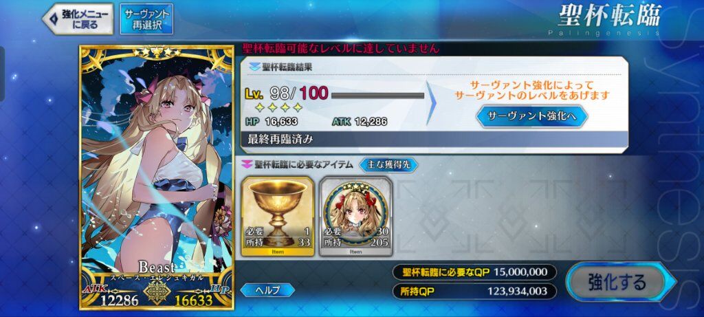 喔我的天啊!雖然一直刷殺狐的素材但還是缺好多,所以就跑去升級角色跟禮裝,結果弄滿村正技能跟把太空艾蕾及泳裝艾比升到100等後,QP就被蒸發了XD 乾,我的老天鵝