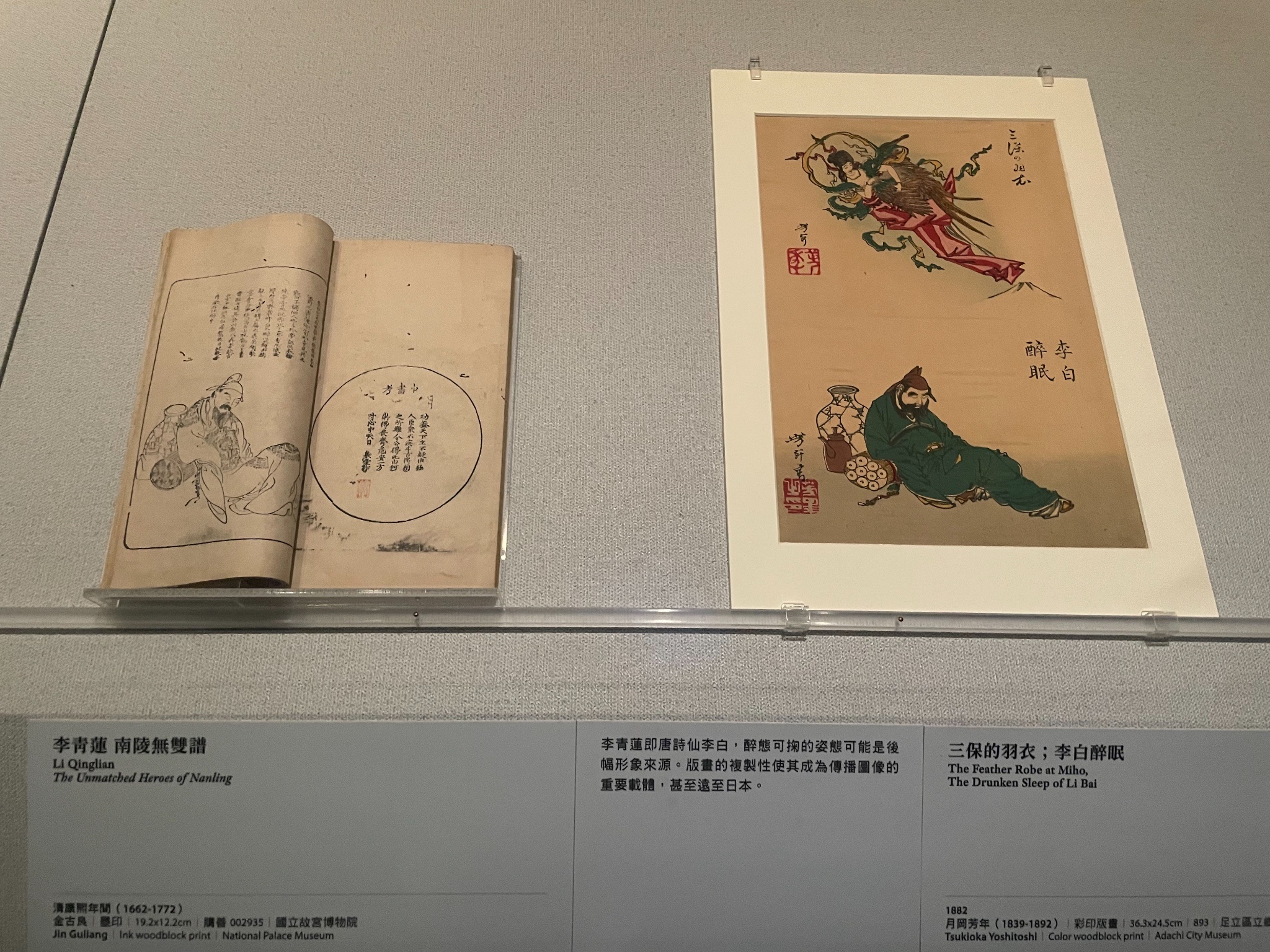 左側金古良畫李白的圖,疑似影響了右側月岡芳年的版畫,然後講座的主持人(故宮博物院副院長)表示,她有在故宮的一個壺上面看過類似的圖樣。
