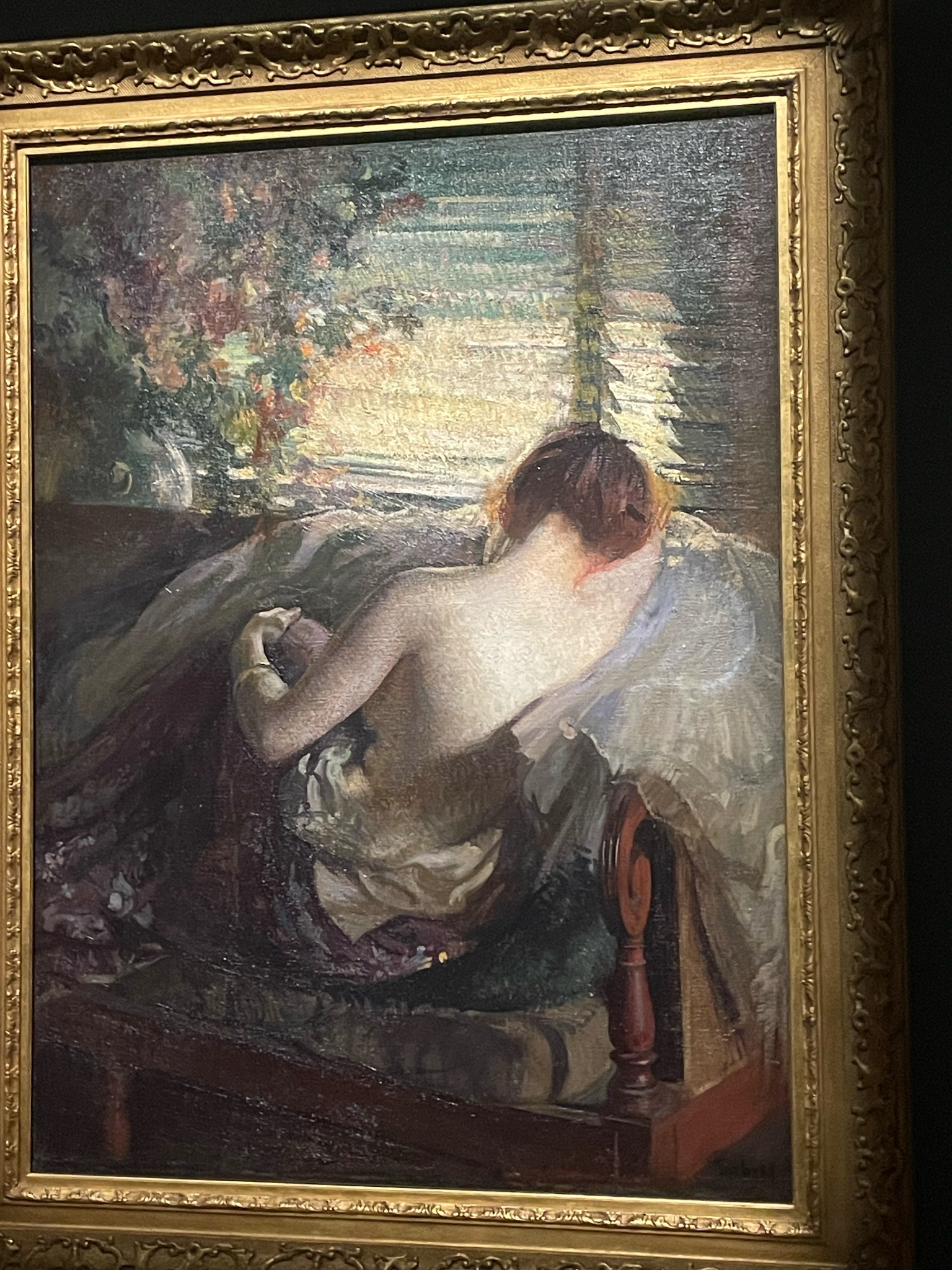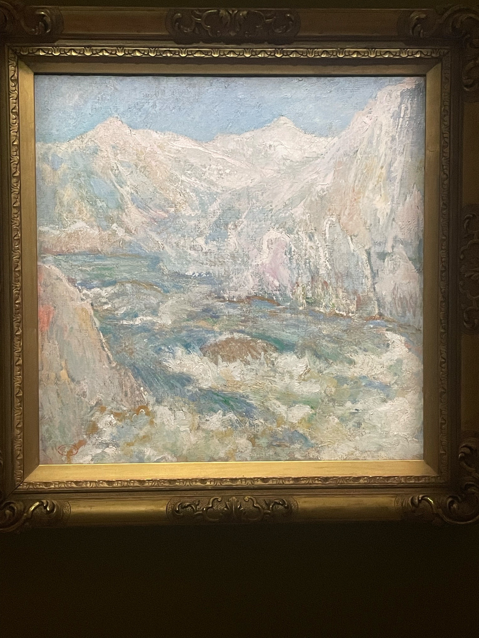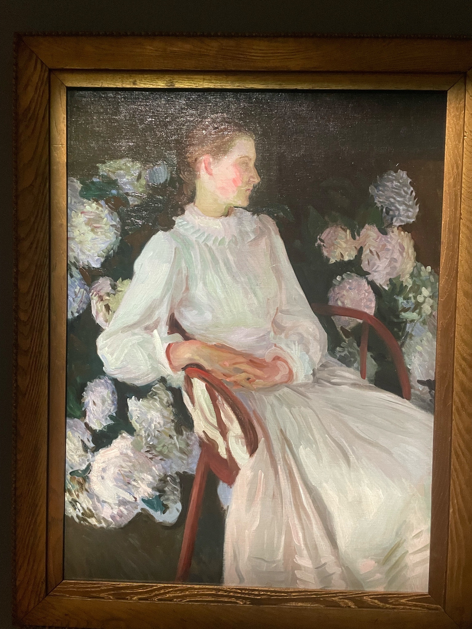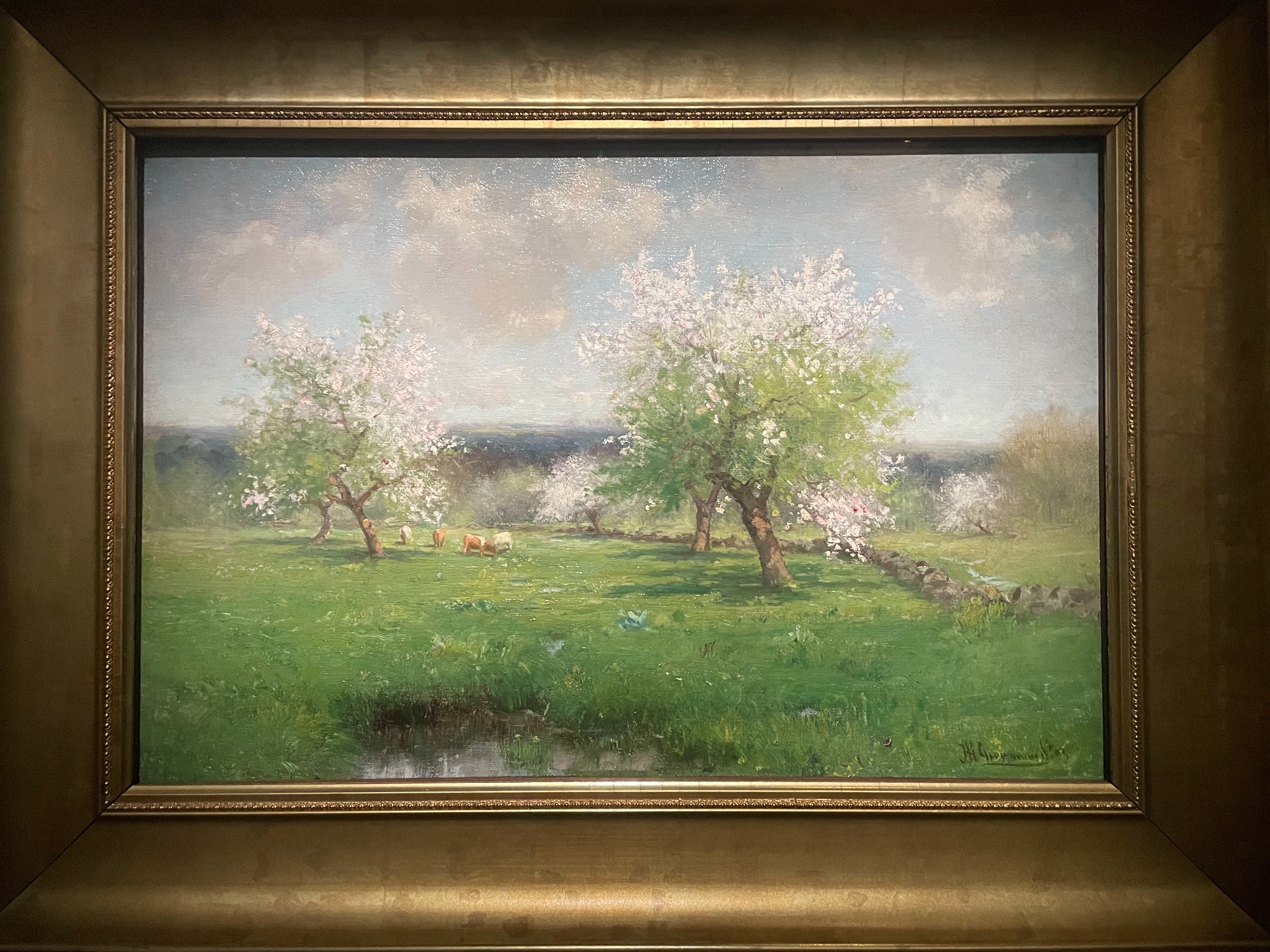 喜歡展場的音樂,很有氣氛,展間的設計也算有小巧思,有個展間的左側是巴比松派、右側是印象派,細看可以感受到兩個畫派對於細節的追求差異。我也喜歡美國印象派、色調主義等知識點,可惜的是,有點看不出來美國畫家「具體」如何把印象派給在地化。