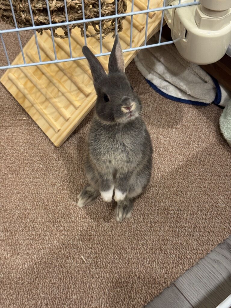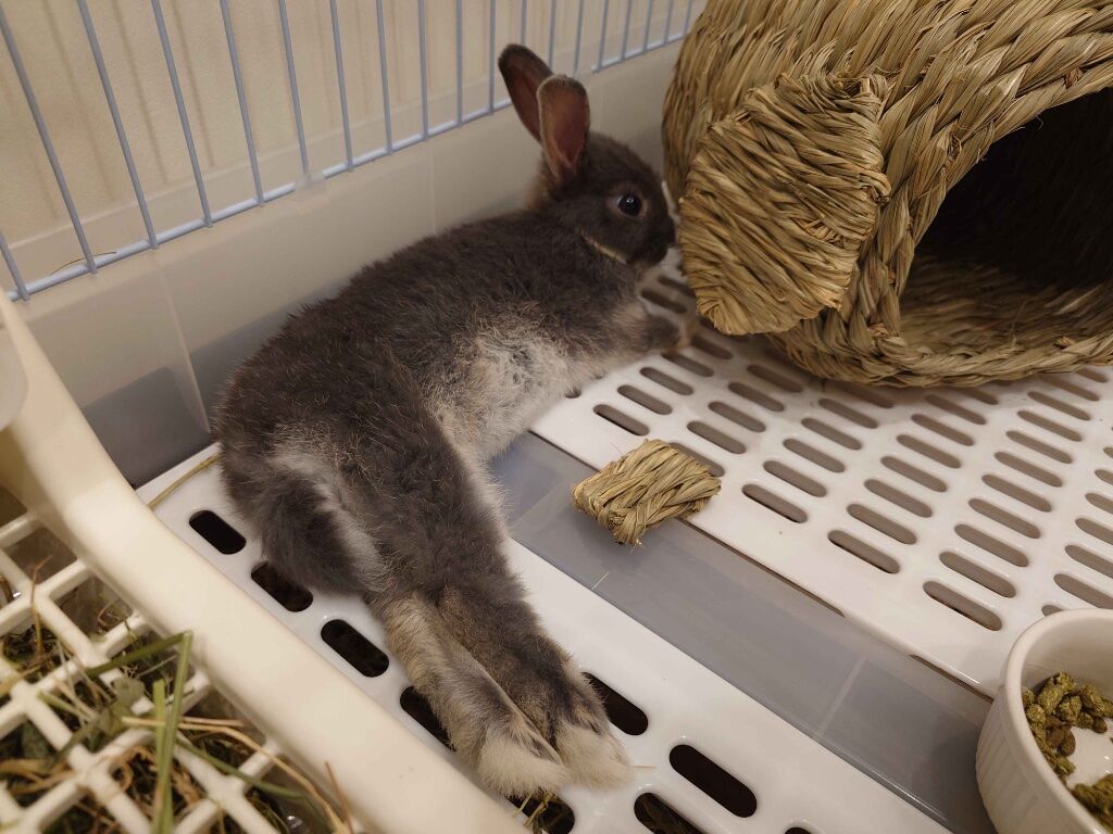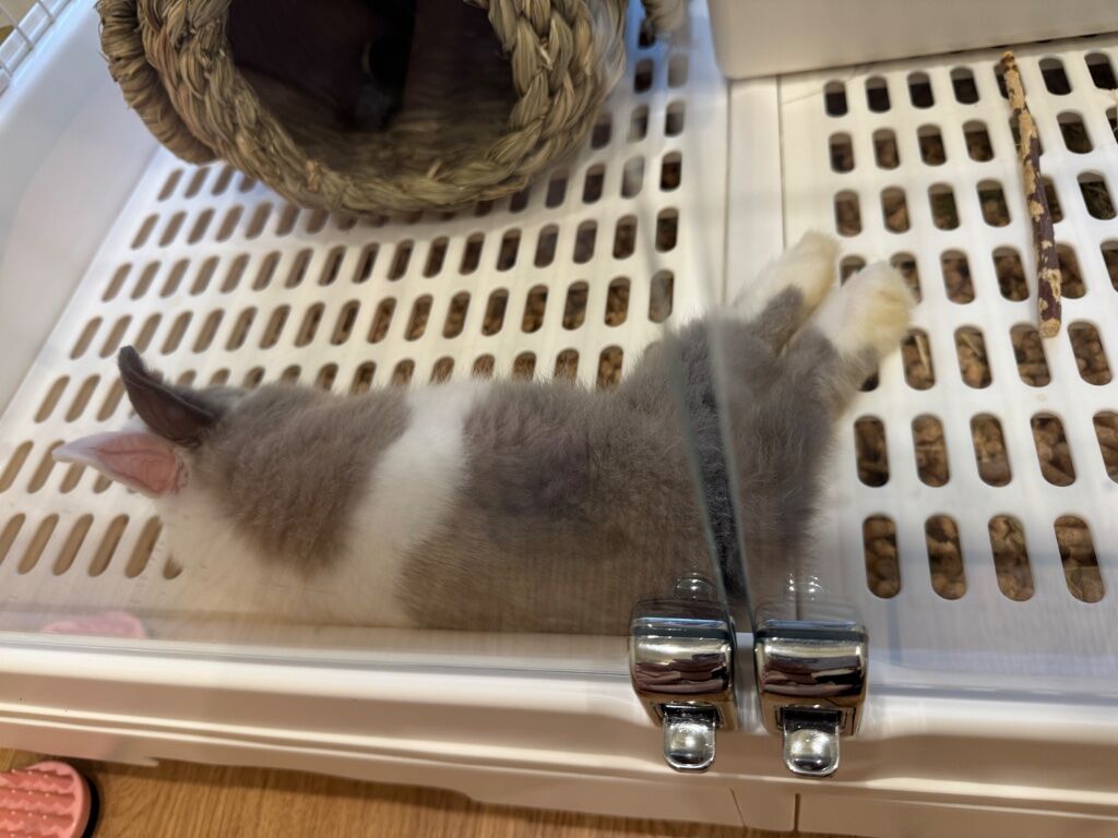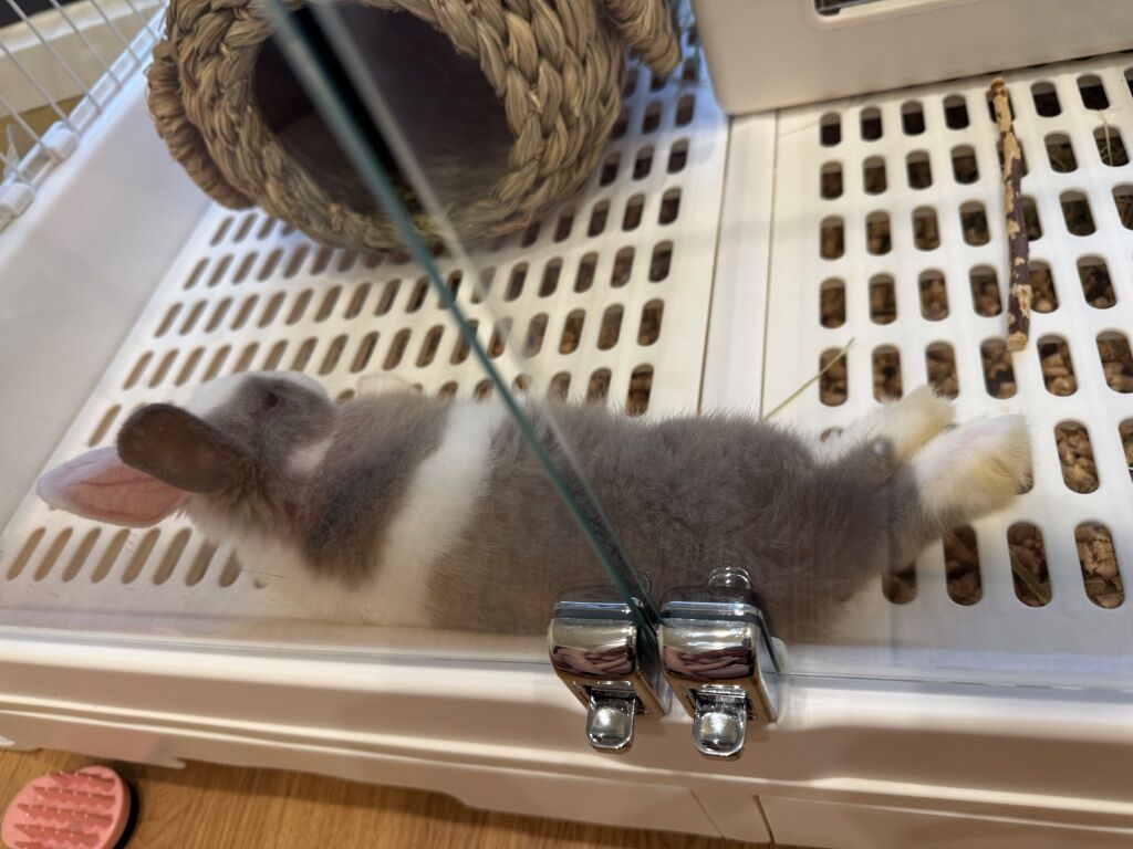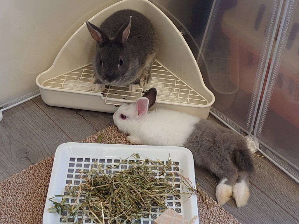 目前兩隻兔子之間的相處還算融洽,除了因為還沒絕育所以沒辦法長時間放他們互動,但有一點挺好笑的事情...派派超級喜歡他妹妹的房間,可以進到他妹妹房間之後就不出來,然後還吃妹妹的草(炸)