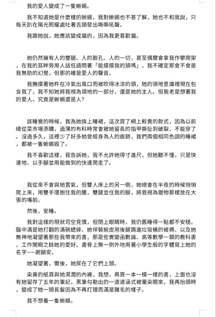 百合向……嗎?老實說我不確定,總之是愛人變成蜥蜴的故事(我前幾天真的超想變成傘蜥蜴就變成這樣了