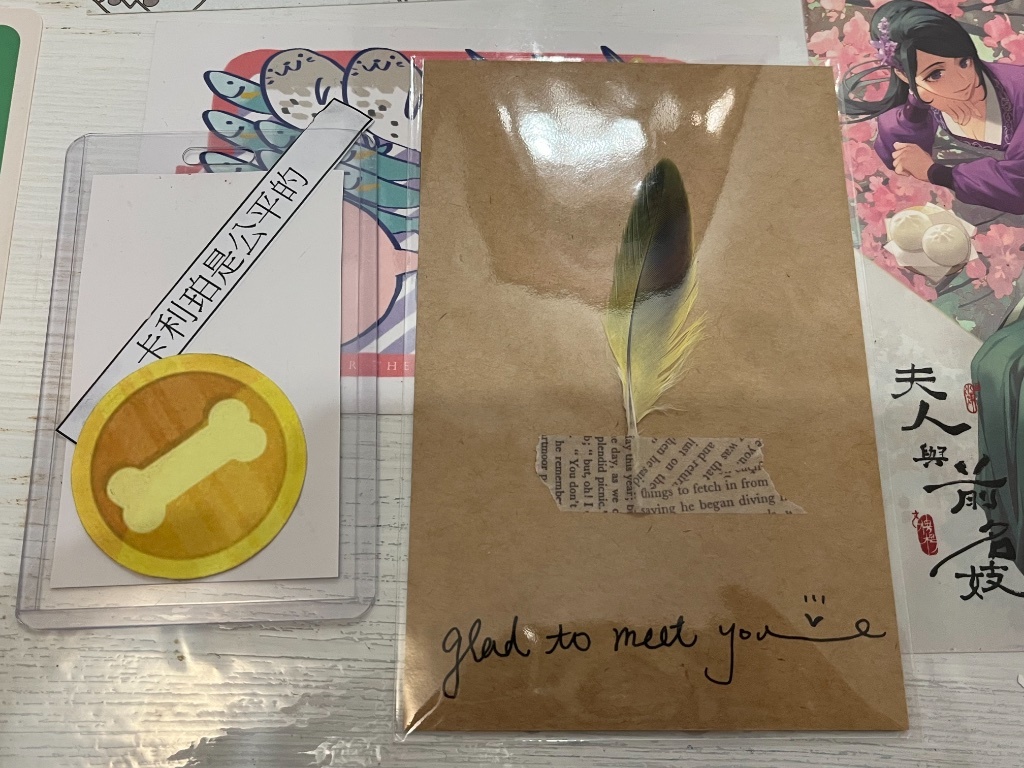 背面:飄做的噗幣貼紙、Alviss幸運餅乾抽到的紙條、阿蚊卡片背面有羽毛呦!
