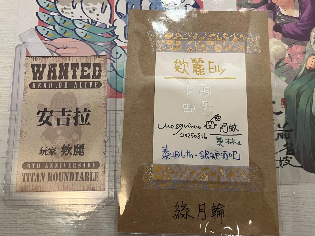 正面:六週年活動的名牌(我拿它在法羅押女神Q贏了4枚代幣呦 自滿)、阿蚊的卡片