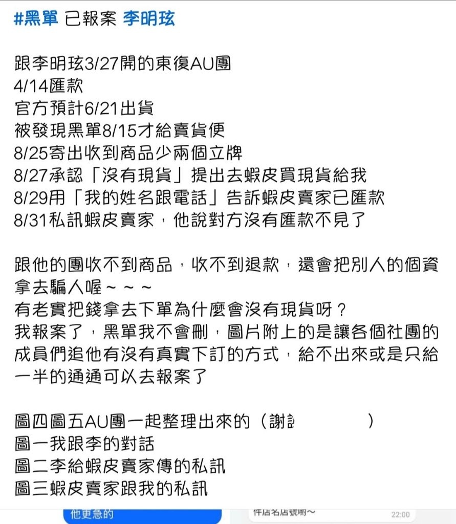 hotdog8103: 我的部分當天就急著想處理了,我不跟她談讓她先處理團員的,團員接受無卡退款的兩天內幾乎都有收到,有些人會要求無卡匯款時旁邊寫一張她名字的紙條拍照,空包的大概一兩周內處理完,剩下的可能想等商品我就沒有繼續追,但是她沒有在我壓的時限內完成表單的退款進度更新,隔了快一個月才跟我說處理完了,我把和解書送警局的時候已經不受理了,拍照給她請她出庭時自己附上(警察說的),然後剛剛請人來傳話,話里話外覺得是我晚交的問題