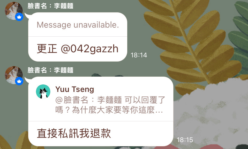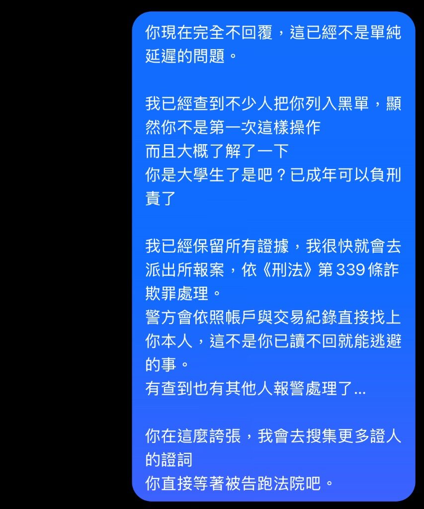 還想跟人和解,先把錢跟東西吐出來吧他我說我早就私訊你了好嗎?後面才給我看訊息,說等我一下喔