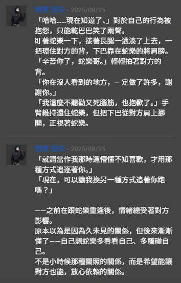 喜歡手筋忍不住努力了一下這是我第一次畫手筋欸尤其是對雨宮一頓爆炸之後冷靜下來誇獎雨宮做的很好那邊我真的哭出來,大概是從這時候開始超級喜歡主任的