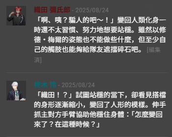 這邊很可愛,織田表面上雖然在胡鬧但其實心裡有著巨大波瀾,本來吧在真身的時候就被注水了、現在恢復人類之身還要被水包圍,他意識到在這邊根本逃不出水這個致命武器所以只能笨蛋連發了