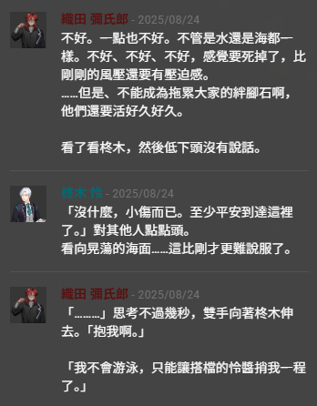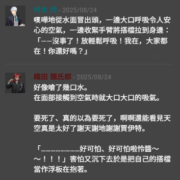 織田:我怕水真的好怕水但是神殿要塌了現在不逃就是會被掩埋,自己被掩埋還無所謂但是不能讓身邊的人陪著自己失去性命所以眼睛一閉牙一咬大不了就再體會一次那次躺在大水缸裡面的灼燒感罷了