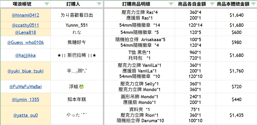 品項 + 數量 (可選款記得備註款式或人名)