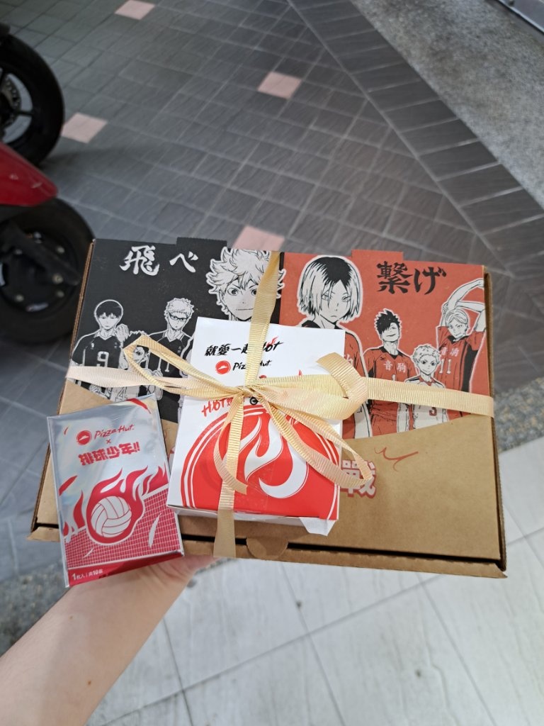 去買必勝客排球聯名披薩,吃到最後才發現盒子旁邊印著「不准低下頭!除了吃披薩的時候」