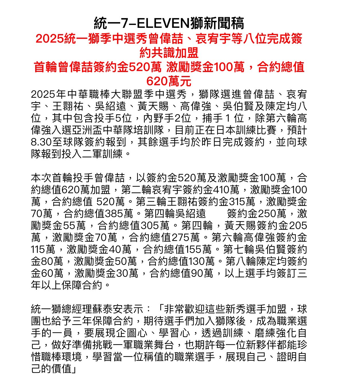 統一獅 #曾偉喆 成為職棒選手的第一天!