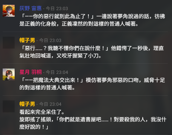 漸漸地對殺人感到麻痺了後邀星月一起當殺手搭檔,在新手教學的時候會說:想像一下你的推角是怎麼死的,而奠定了對方的殺手路。