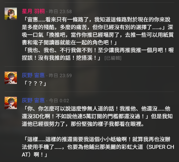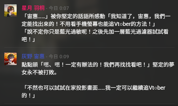 兩人都不會同擔拒否,會幫星月棄夢後送掉她不要的周邊給其他人,還會排好寫一串感謝信。