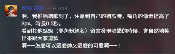 平時語速很快,提到推角的事情會更快速,但投sc的時候也只是短文配彩虹sc,長篇心得都在推特裡,有發黑用小帳但當了殺手後就用不著了。