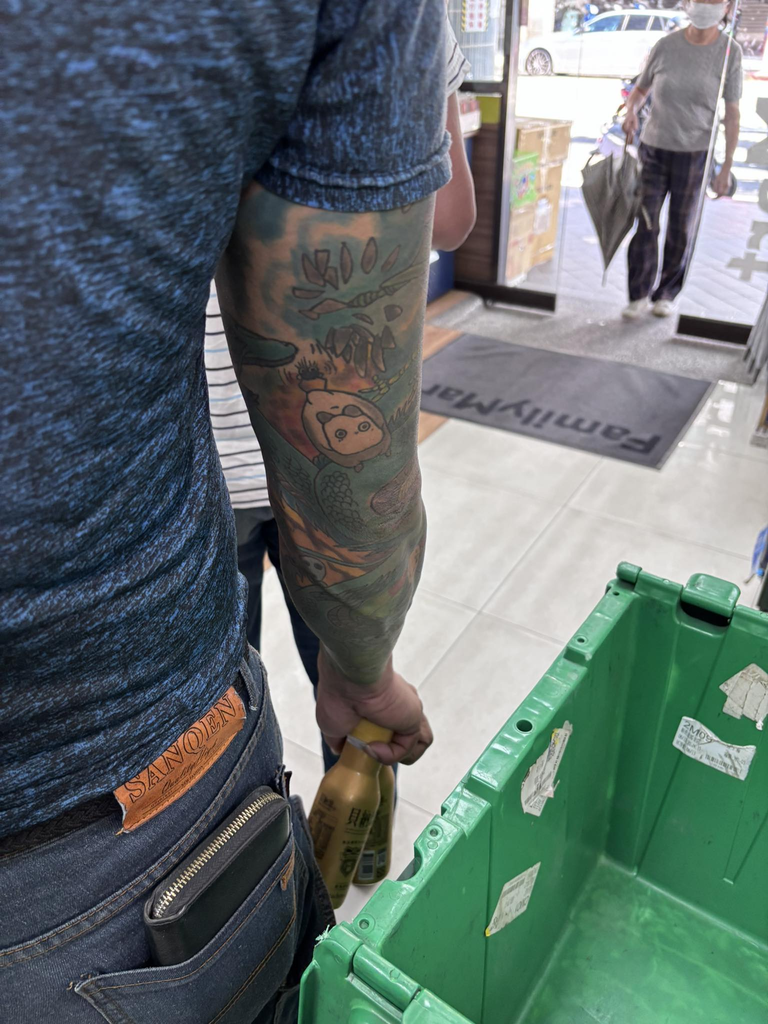 早上都會去公司附近的全家買早餐,意外有個平常沒看過,手上佈滿刺青的男子在排隊,面無表情看起來超可怕沒人想排在後面(但我趕時間還是去排了)