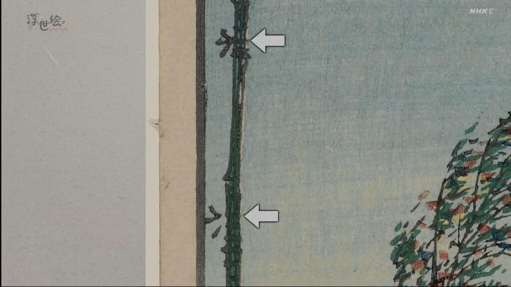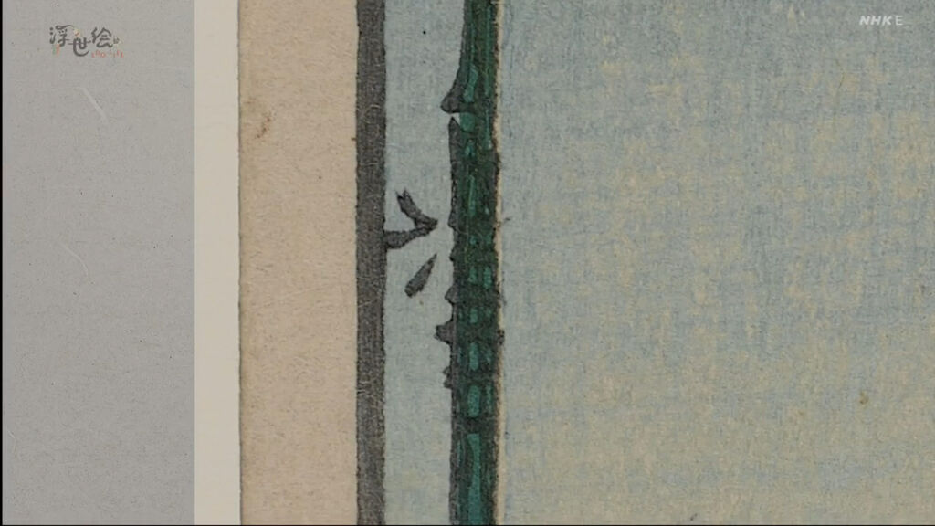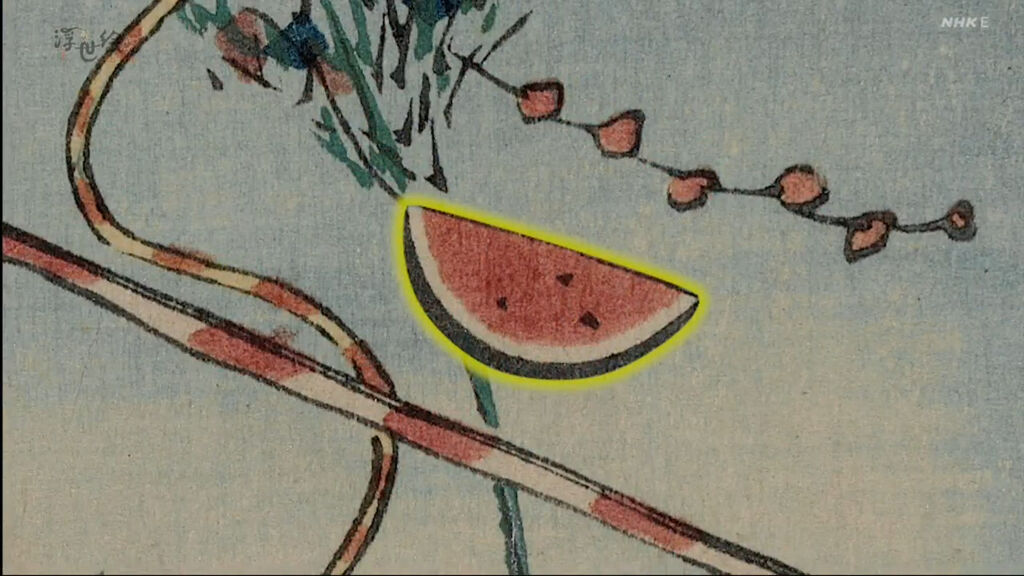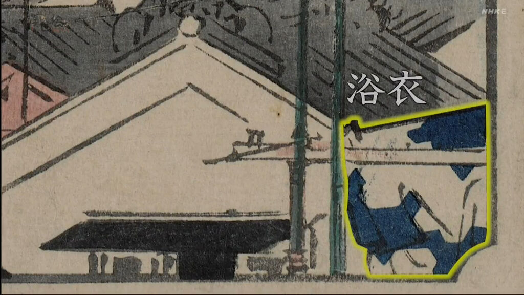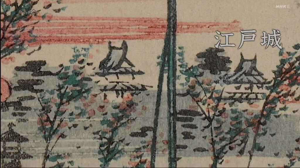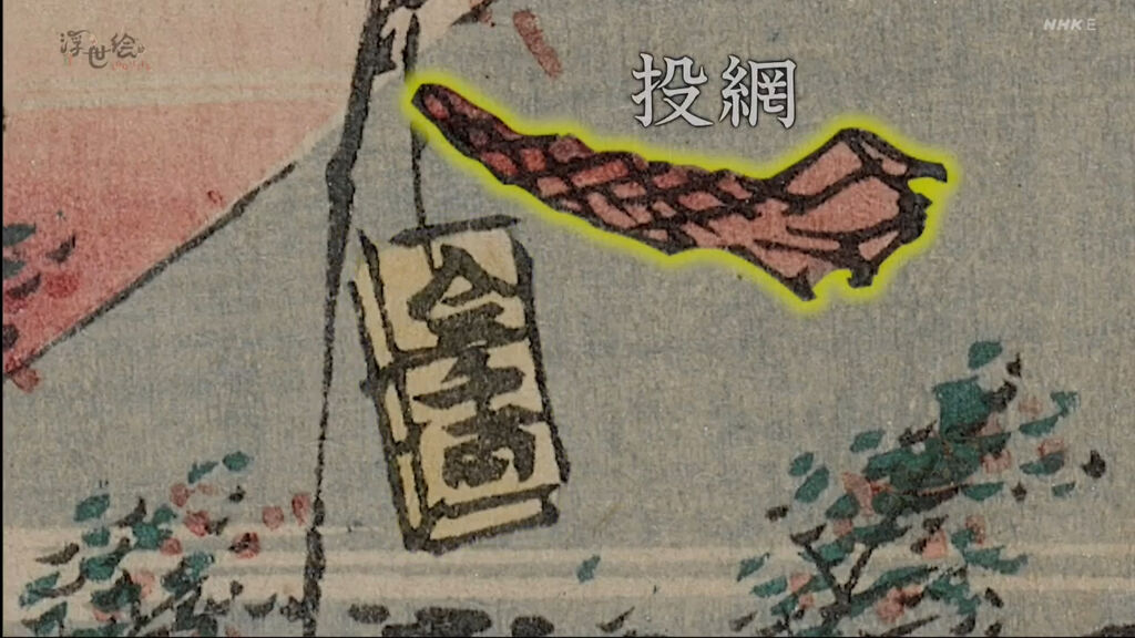 城鎮的前方可以看到富士山,富士山的右側是江戶城,最前方是四座白色的倉庫,由這些情報可以推斷出畫中的地點是京橋。每到七夕,江戶的街頭總是會出現這樣大撒幣競相拿出華麗裝飾笹竹的風情