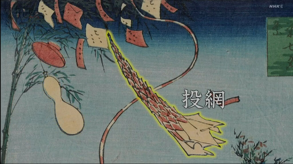 將寫上願望的長條紙或裝飾掛在笹竹上,是七夕的風景。江戶的七夕祭,掛在笹竹上的裝飾品,有碗?瓢簞?和漁網?真是好熱鬧啊。還有、裝飾的飾帶不會太長了嗎?比房子還高耶