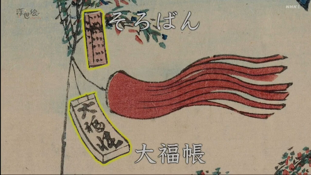掛在笹竹上的算盤和大福帳,大福帳是現在所說的店鋪帳簿。還有金千兩,金千兩當然就是祈求發大財,漁網就是漁夫們用來祈求大豐收
