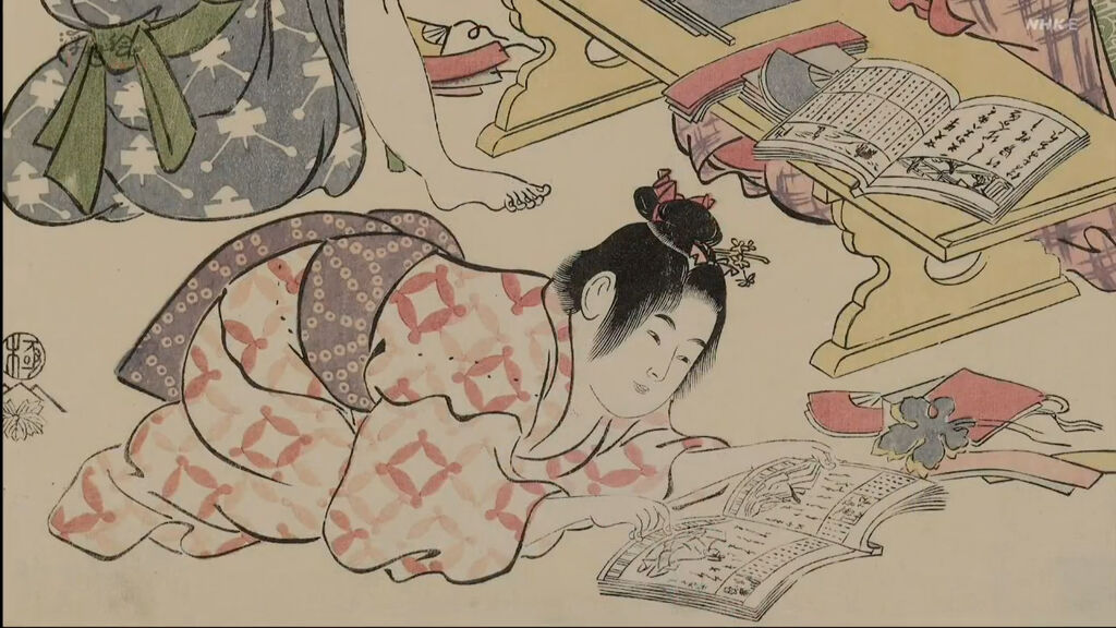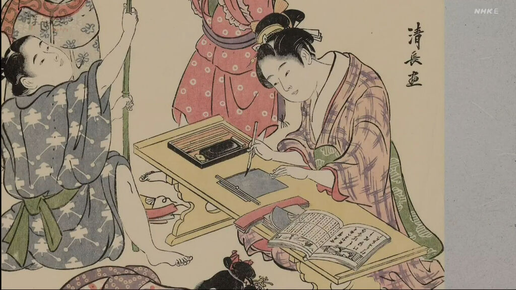 右下方的女孩子,一邊看著書,一邊拿起筆,正準備寫些什麼。她正在閱讀《女大學》這本記載女性品德修養的書籍,並將其中的文章抄寫在紙上,祈願自身技藝的提升