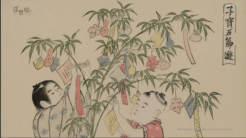 另外一件作品《子宝五節遊 七夕》鳥居清長,畫中是正在裝飾笹竹的孩子,不知道寫了什麼願望呢?