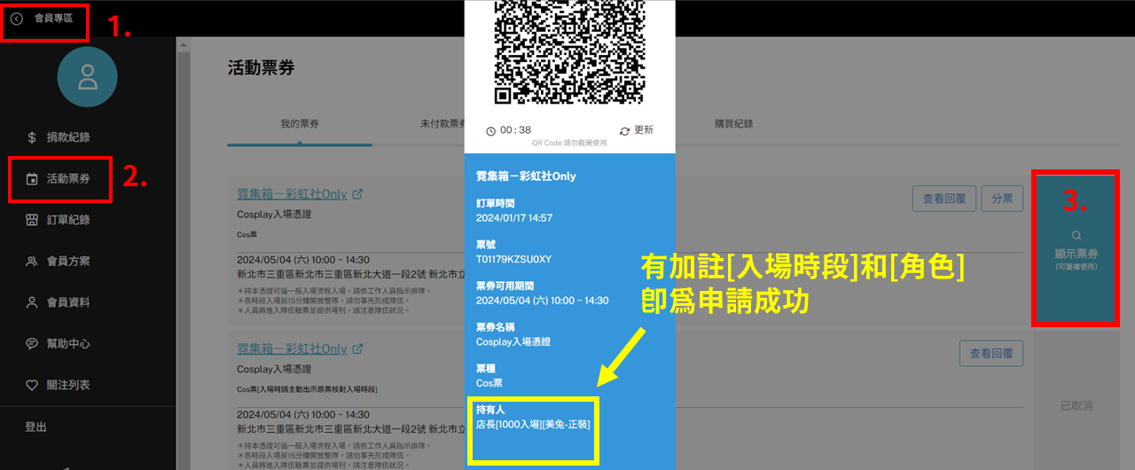 4. 活動前一週,籌辦組會進行人工審核,將您的cos憑證姓名加註「入場時間」,並作廢您的預售票(狀態將顯示為已使用)