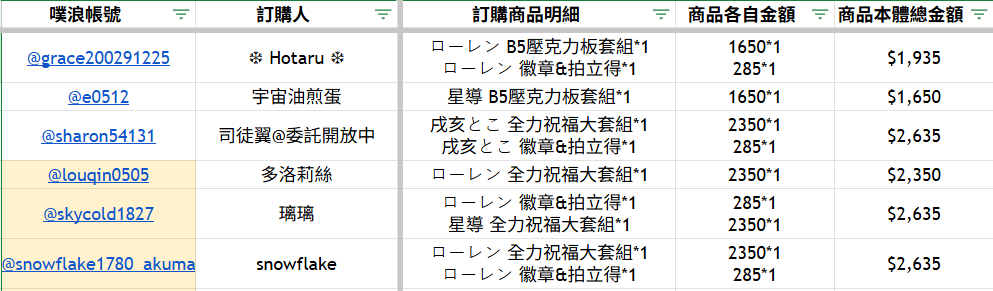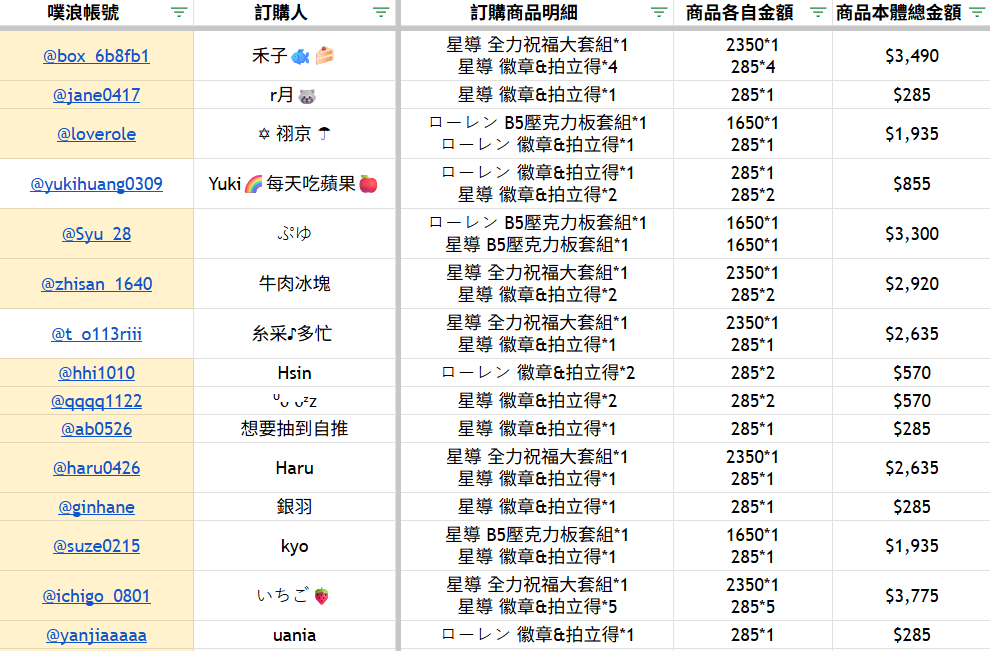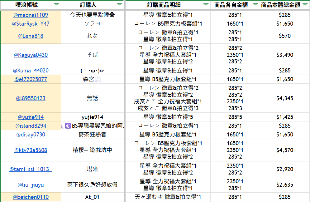 各位的喊單明細