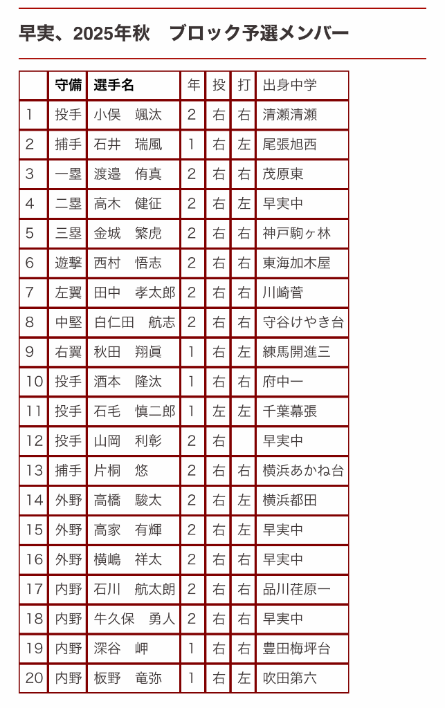 早實一次預選20人名單