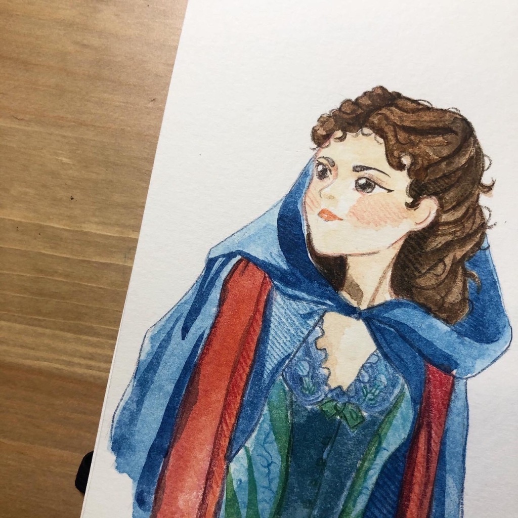 這是今天剛完成的,因為看了歌劇魅影電影版重映,發現幾乎每一套我喜歡的舞台版服裝都被換掉了,傷心欲絕,所以發奮要將我喜歡的克莉絲汀經典裝扮一張一張畫起來。