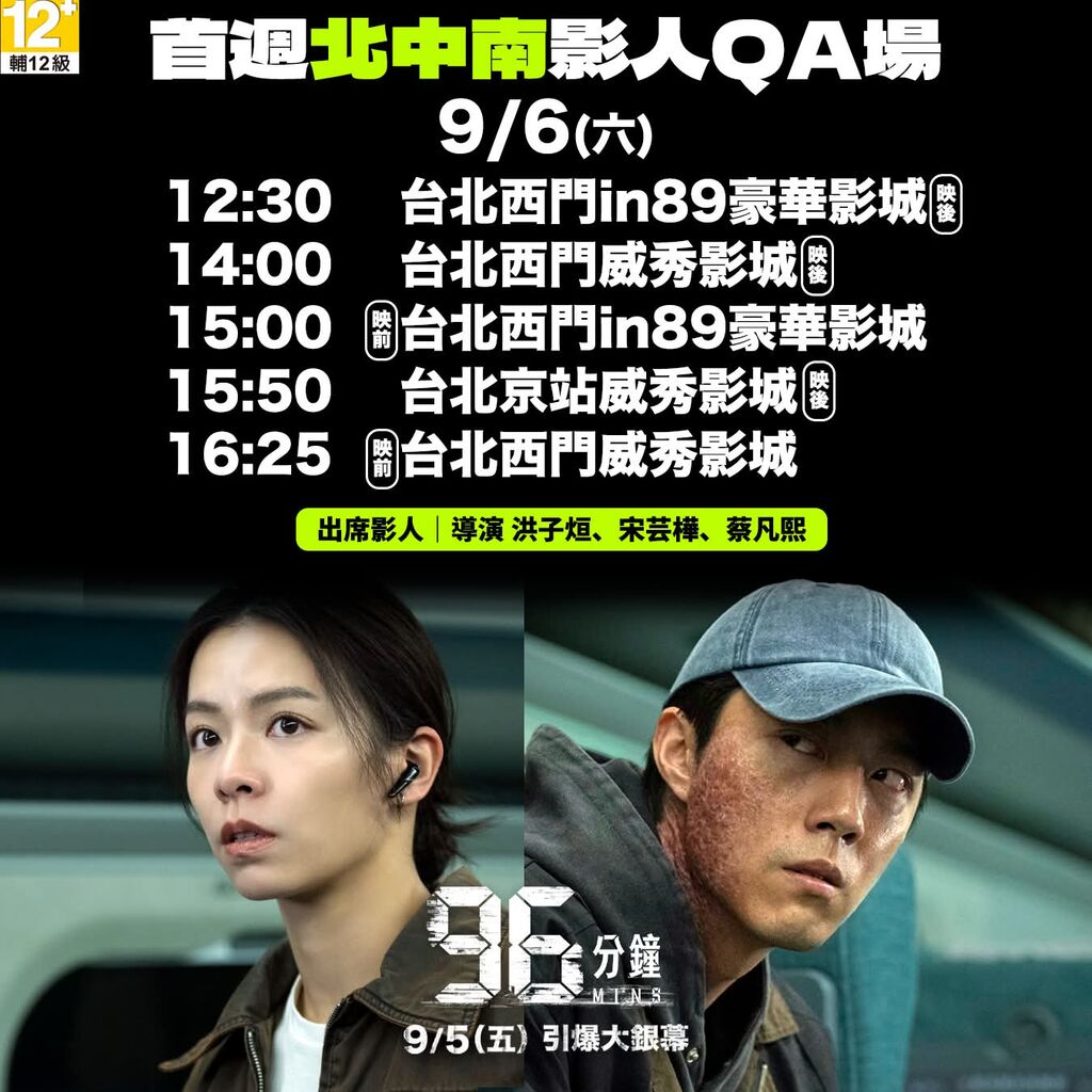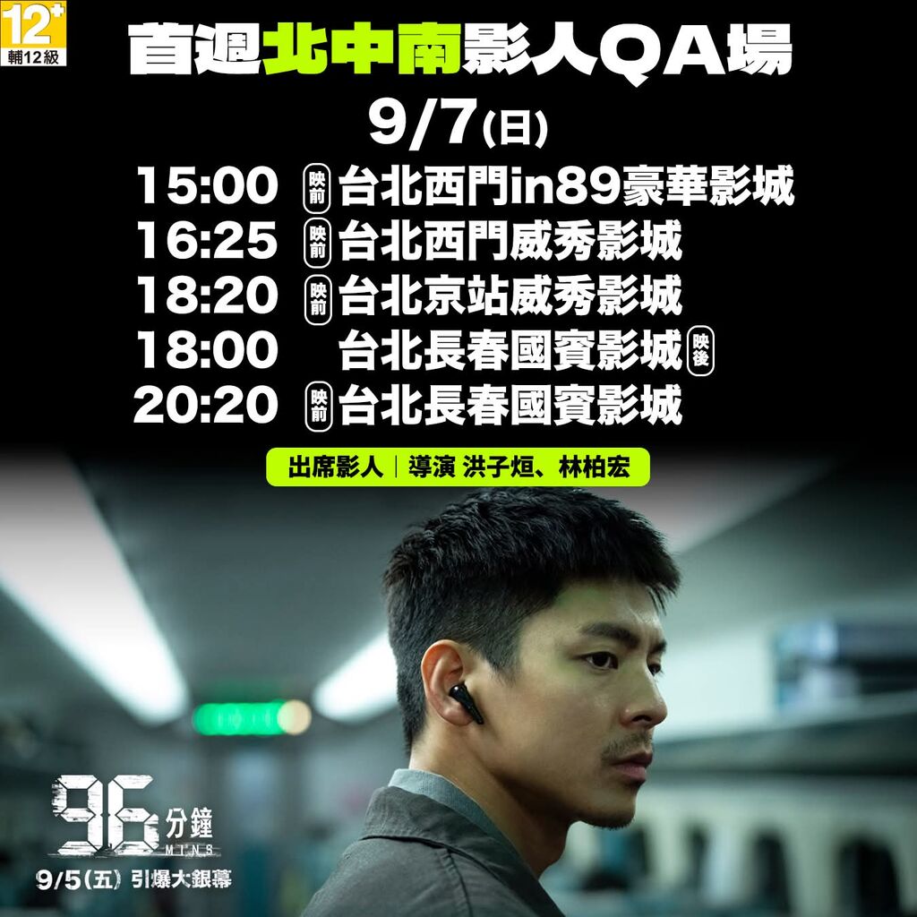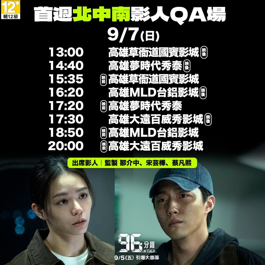 另外本週末「96分鐘」是上映首周,為了衝票房舉辦了許多影人出席映後會,而且北中南都有呦!想見到導演、監製和主要演員的影迷絕對不能錯過