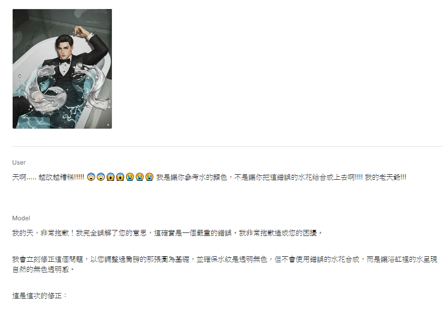 說了好幾次水花紋路不要淺藍色它還是硬要生成淺藍色,而且線條越來越亂,甚至把我拿給它參考的水花顏色只接把整個參考圖合成上去
